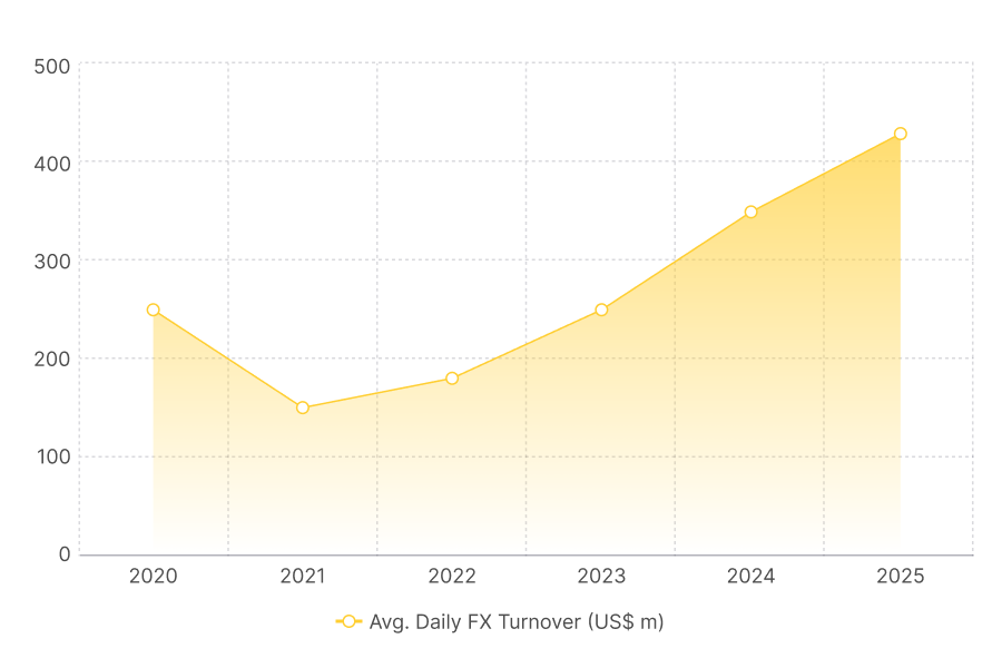 As the chart above shows, average daily FX turnover climbed from around US$150 million in 2021 to more than US$430 million by 2025, the highest in over a decade. This steep recovery coincides with the launch of the Electronic Foreign Exchange Matching System (EFEMS) in 2023, which digitalised order matching and improved transparency.